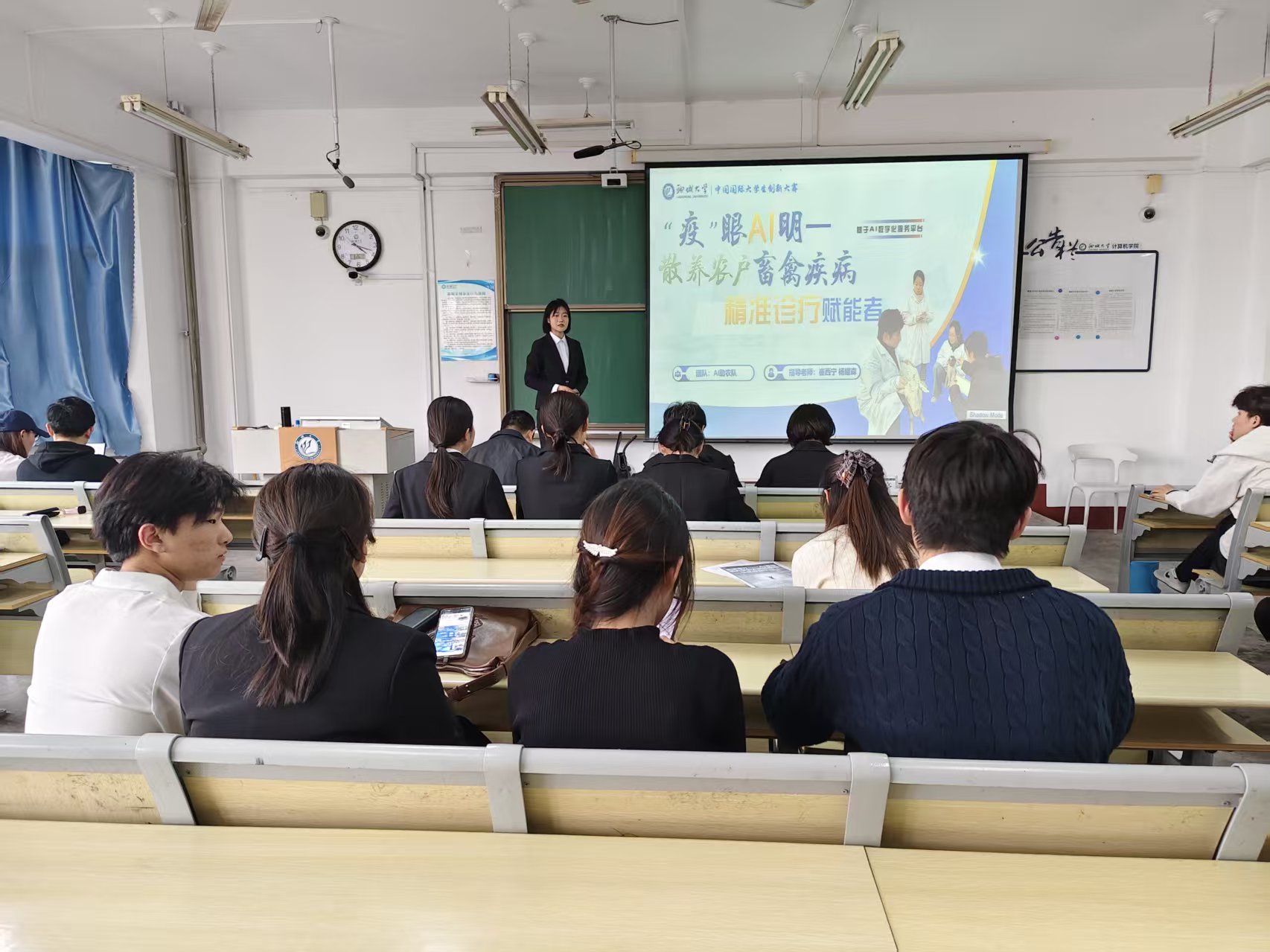 答辩现场,各团队汇报人通过PPT、视频、实物模型等形式,生动展示项目创新亮点与实践成果,充分展现我院学子扎实专业功底、严谨治学态度与勇于探索精神,彰显“以学促创、以创践学”的优良学风。其中,AI助农队依托Al视觉与大数据技术,为散养农户提供低成本畜禽疾病智能诊疗方案,助力畜牧业数字化转型;心语译者团队研发智能手语翻译眼镜,实现手语实时转译,搭建听障人士沟通桥梁,用科技传递人文关怀。在评委点评与问答环节,评委老师结合汇报与申报材料,从技术、应用、价值等层面细致研判,精准追问技术难点与创新亮点,结合行业趋势剖析市场前景与转化路径,在肯定创新思路的同时,从技术优化、方案完善等角度给出具体指导,为项目后续迭代升级指明方向。参与答辩的同学们表示,本次答辩既是成果检验,也是宝贵的学习机会,不仅为项目推进和科研深化提供了指引,也加深了对创新创业的理解。