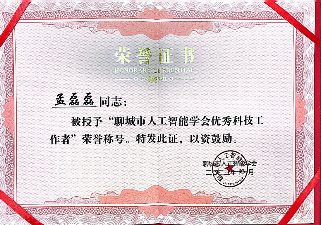 2023年11月11日,2023年聊城市人工智能学会年会暨科学大讲堂成功召开。会上,聊城市科学技术协会副主席潘云霞等为获得聊城市人工智能学会优秀科技成果奖及聊城市人工智能学会优秀科技工作者的代表颁发证书。我院教师孟磊磊博士获得聊城市人工智能学会优秀科技工作者称号。