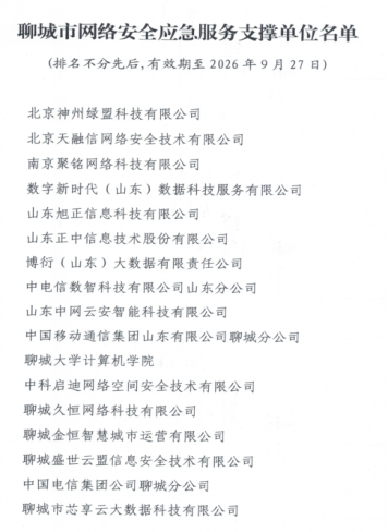 历经相关单位自主申报、材料审核、审批等环节严格筛选, 近日,聊城市委网信办发布了《聊城市网络安全应急服务支撑单位名单》,最终共有17家具备强大技术实力和社会责任感的网络安全机构脱颖而出,bv1946伟德位列其中。