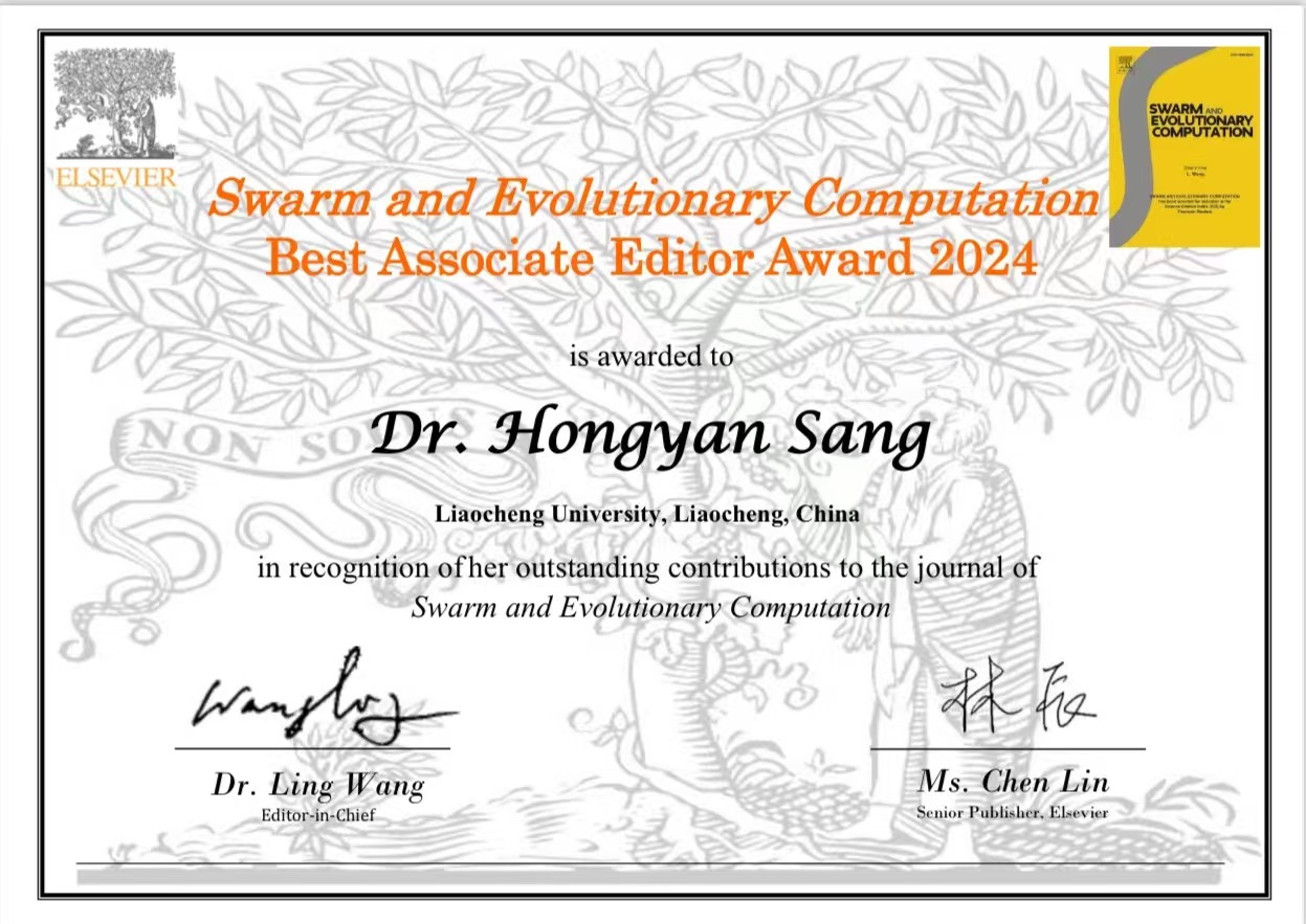 近日,我院桑红燕教授获中科院一区期刊《群体与进化计算》(《Swarm and Evolutionary Computation》,SWEVO)2024年度最佳副主编奖(Best Associate Editor Award) ,以表彰其对期刊发展做出的杰出学术与服务贡献。 据悉,爱思唯尔(Elsevier)出版社根据稿件处理数量、质量、效率等进行综合评价,从SWEVO期刊66名副主编中遴选5位授奖,这是该期刊首次评选此奖项。荣获此奖,不仅表明桑红燕教授在群体智能领域具有重要影响力,也有助于提升伟德源自英国始于1946在相关领域的影响力。 《群体与进化计算》(《Swarm and Evolutionary Computation》)是爱思唯尔(Elsevier)旗下期刊,是群体智能与进化计算领域的权威期刊,收录面向复杂系统的智能优化理论、方法及应用方向的相关研究成果。该期刊的最新SCI影响因子为8.2,中科院一区期刊,JCR分区Q1。